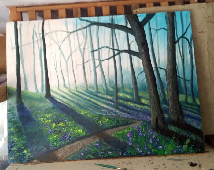 In step 4, I've built the foliage and flowers into the painting. Bluebells and yellow flowers. I've added colour to the forest path and brightened the sun shining in the background between the trees. The trees have been built up with texture and I've put a hole in the top of the tree to give you an idea of size and texture you can stick your finger in this hole. I like to think this is a place for a nest for squirrels or perhaps a bird’s nest.